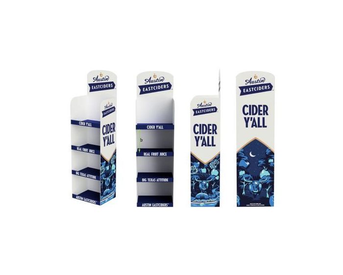 Available in a standard or slim can variation, the case stacker with shelves is designed with 4 or 5 shelves respectively, made of durable corrugate cardboard with four shelves for optimal storage of multiple brands. The standard case stacker with shelves fits up to 4 - 12 packs and 8 - 6 packs of 12 oz cans per shelf, 2 wide x 1 deep and 2 wide x 2 deep, respectively. The slim case stacker with shelves fits 16 cans per shelf. Available with standard or custom shape header at additional cost